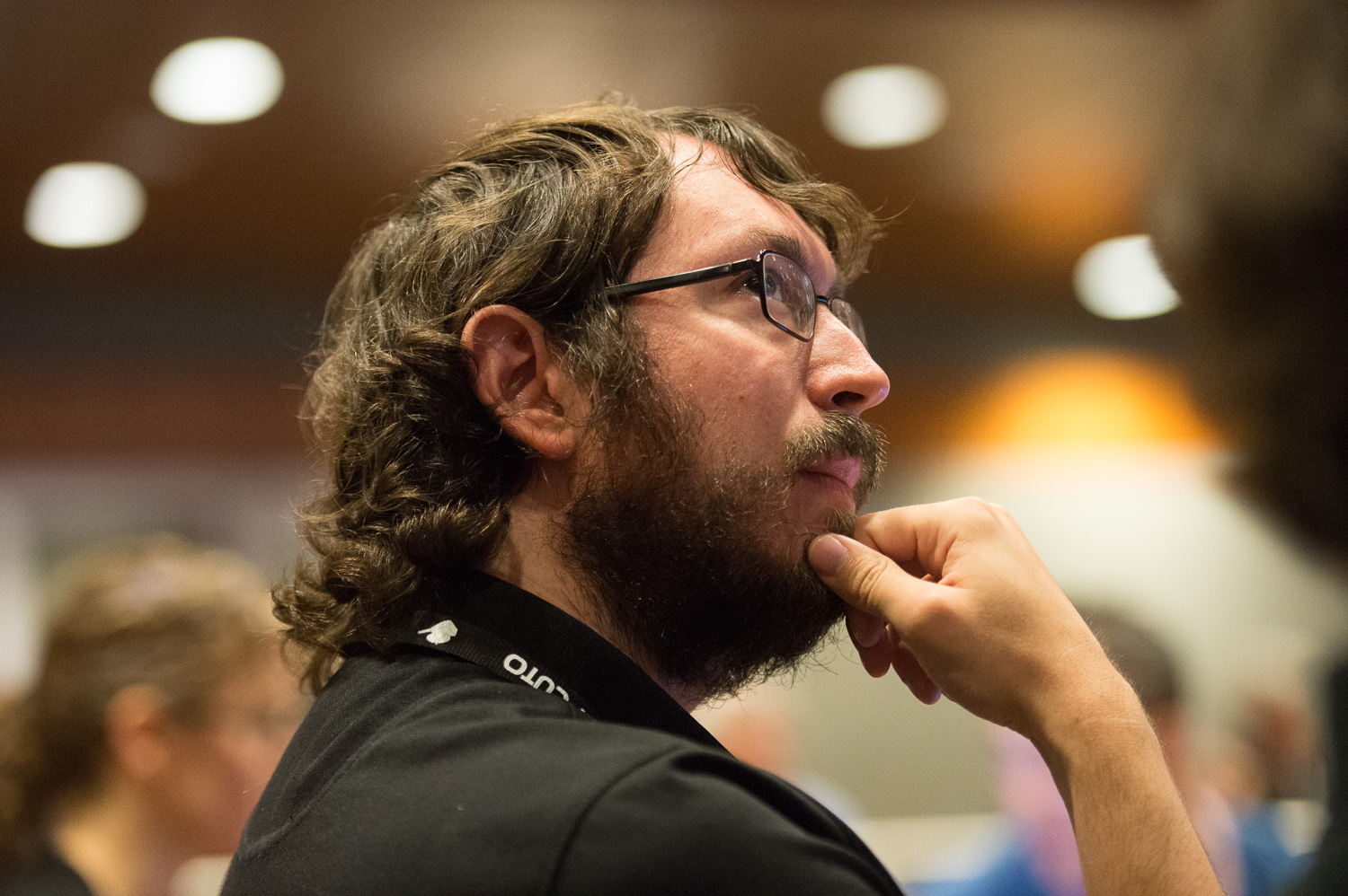 | Room 100 is packed for the morning plenaries, but after that, all the big teams go off to their own rooms for the day. Michael Bird, working for REX, gets a bit of peace downstairs. |
