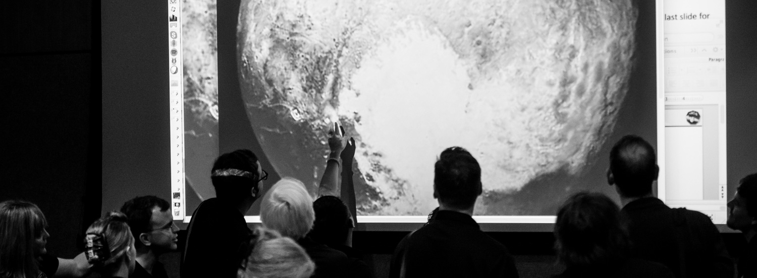 | About to show the first close-up pictures of Pluto and Charon! Dwayne Brown, Alan Stern, Will Grundy, Cathy Olkin, and John Spencer at the P+1d press conference at the APL Kosiakoff Center. If you're going to watch just one movie about Pluto, this is the one to watch. Everything we thought we knew about Pluto has changed in the last 24 hours. All of our models are wrong, and that's why they're all smiling. |