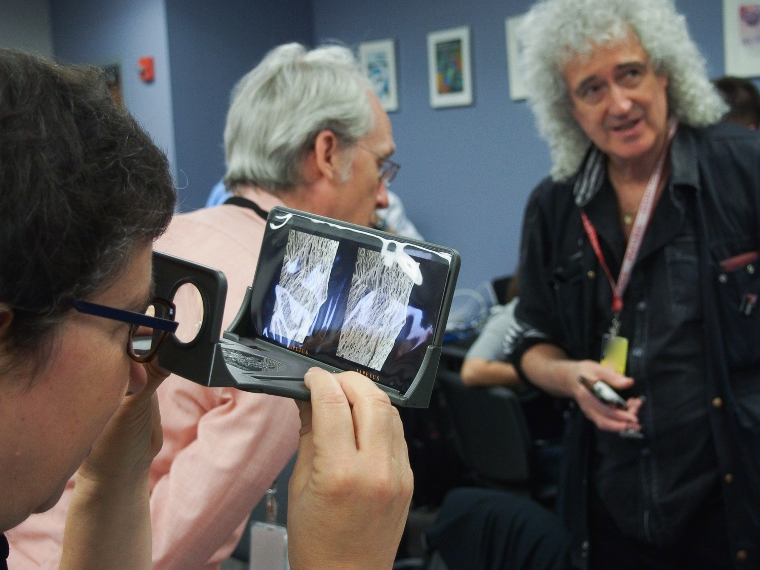 | Brian May has spent the last several years building and selling very analogue stereographic viewers, and making images to view. This is the surface of Iapetus, in 3D, from Cassini data. He also made one up of Pluto itself, based on new images, which was pretty great -- he hadn't printed it, but we could see it on the screen. Check out the London Stereographic Company to get your own! |