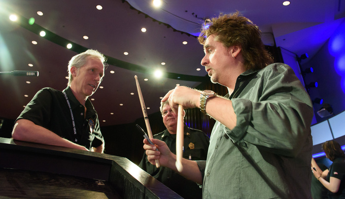 | Styx's Todd Sucherman gives some stick tips to Joel Parker. |
