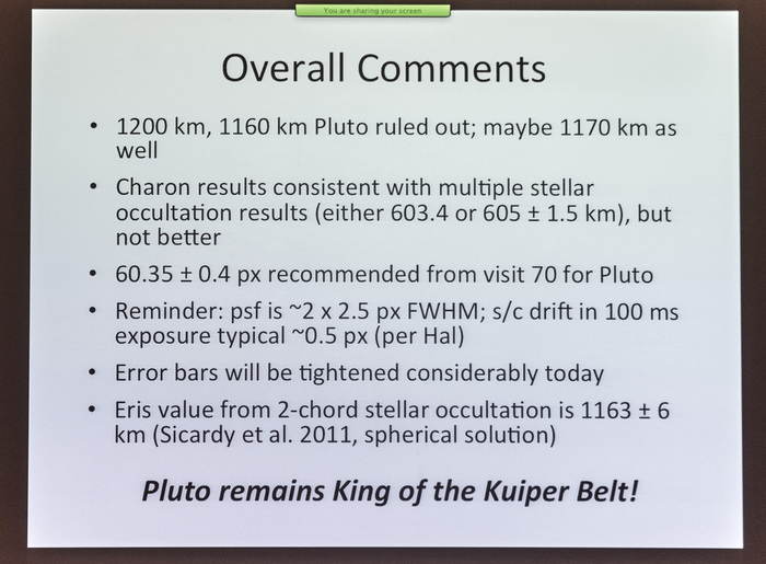 | Summary of latest Pluto/Charon radius estimates, morning plenary, P - 2 days. Pluto remains King of the Kuiper Belt! |
