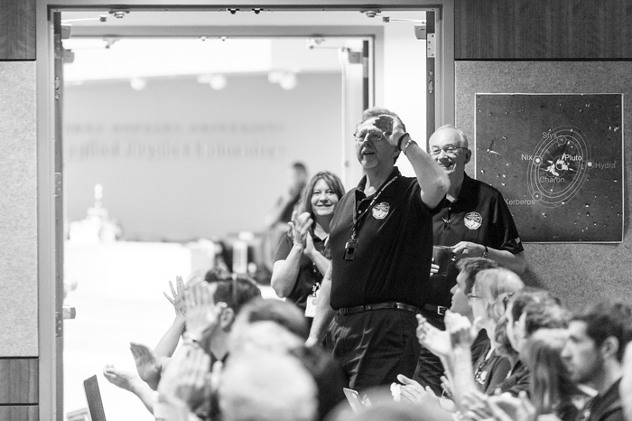 | Mission controllers and engineers from Mission Ops file into the Kosiakoff Center to much applause. |