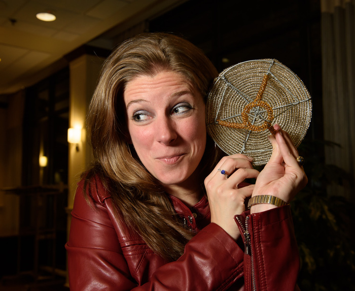 | Kelsi Singer hugs her third-favorite satellite. Photo by Stuart Robbins. |