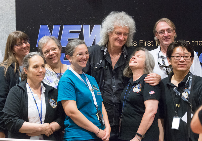 | Alan Stern, Brian May, Hal Weaver. Brian May took a couple of years off from academia to play in a band, but eventually returned and finished his PhD in astrophysics at Imperial College London in 2007. |