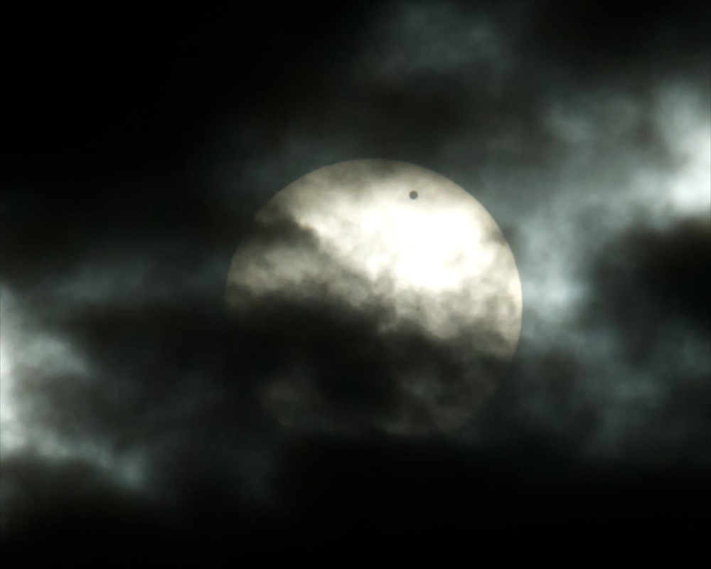 But then after most of an hour of waiting, the sun finally found a low optical-depth patch and was visible! We could see it for about one minute. We were still looking through many many clouds, but I was able to take a few pictures. As a bonus, due to the clouds there was no solar filter necessary! (Actually, I'd tried it out beforehand and realized that with my camera at on its least-sensitive settings, it can take a pic of the direct solar disk without saturating. Nikon D4, 1/8000, 340 mm, f/45.)